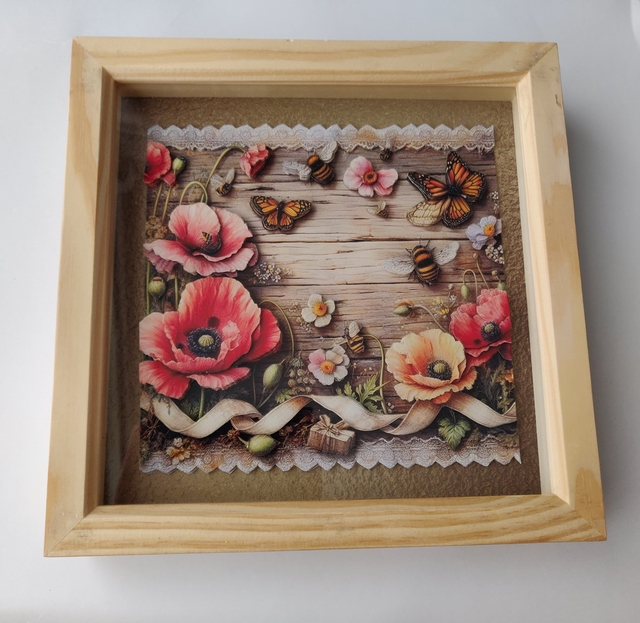 Square deep frame box presentation depicting lovely rustic scene with poppies, butterflies and bees created in decopage style